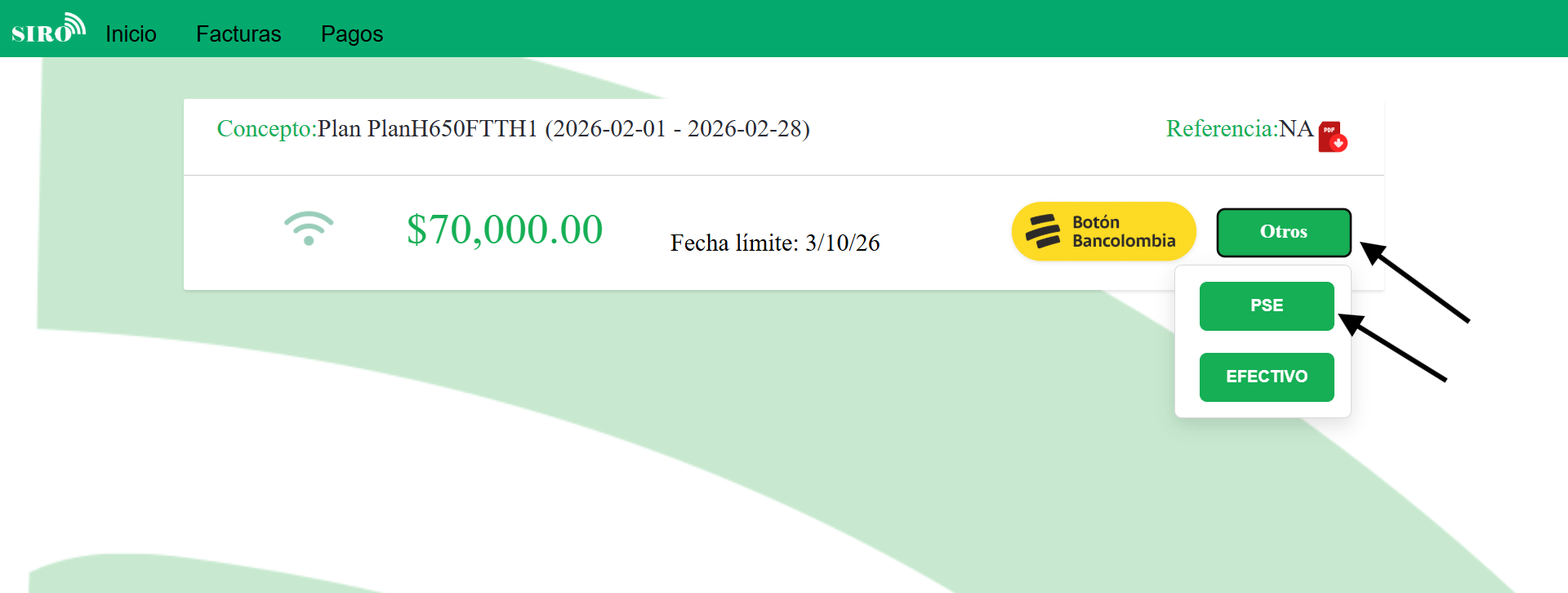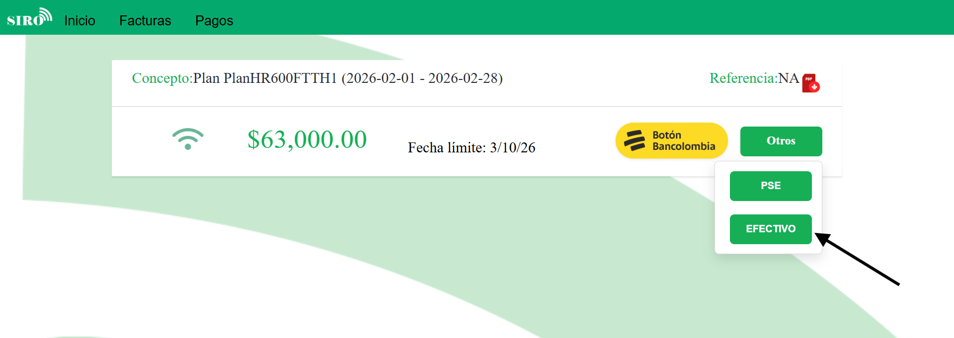 Puede realizar el pago en efectivo en la oficina de SIRO Internet.